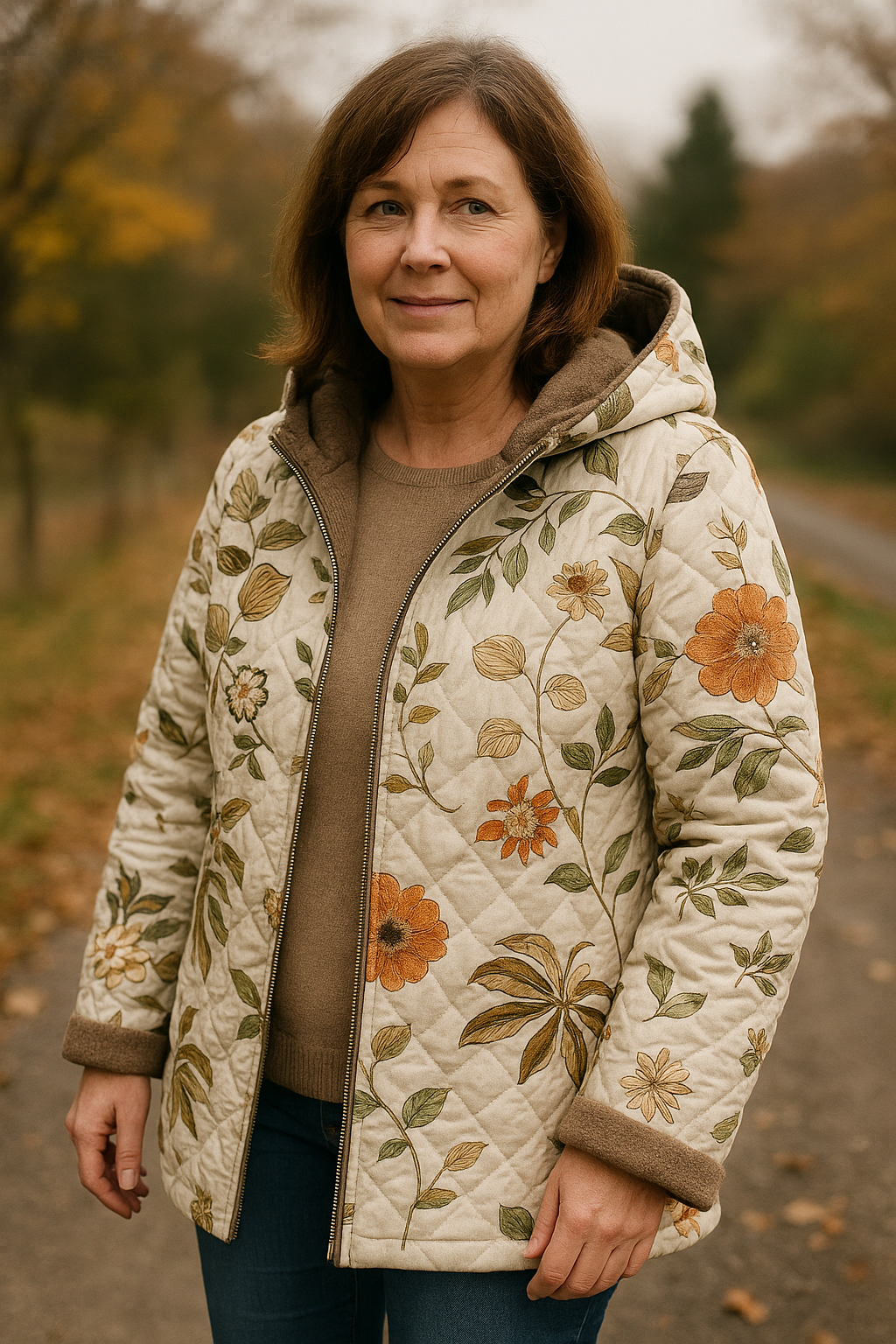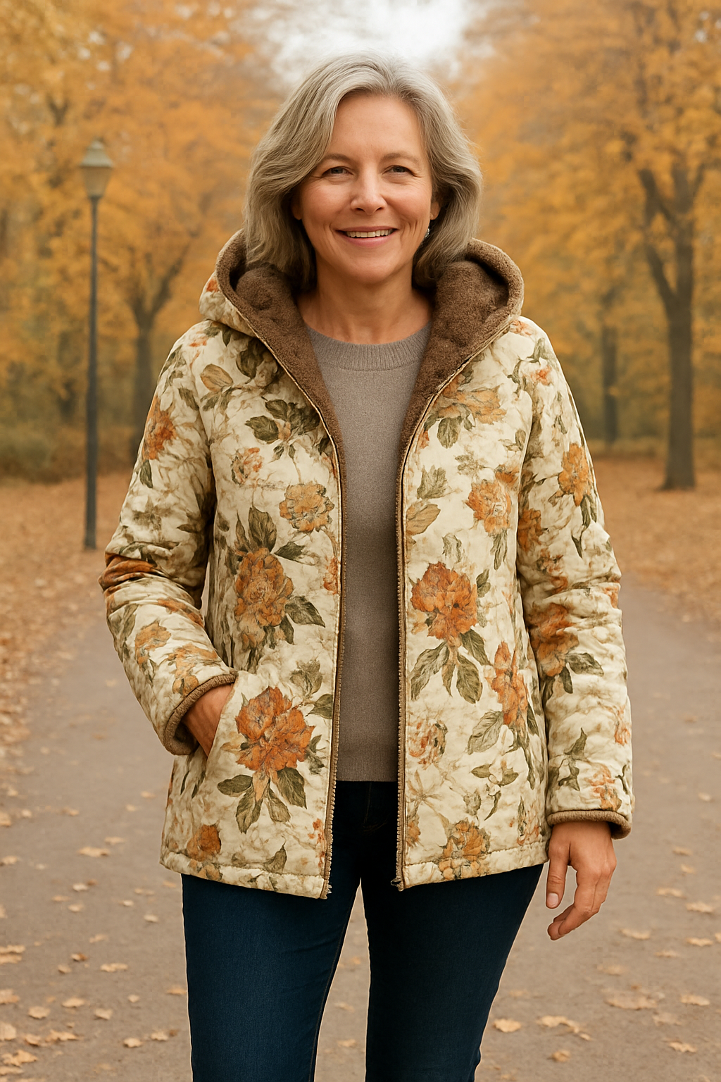 Stylish and functional: A hood, zipper, and spacious pockets offer practical protection, while the floral pattern adds a fashionable touch to any outfit.